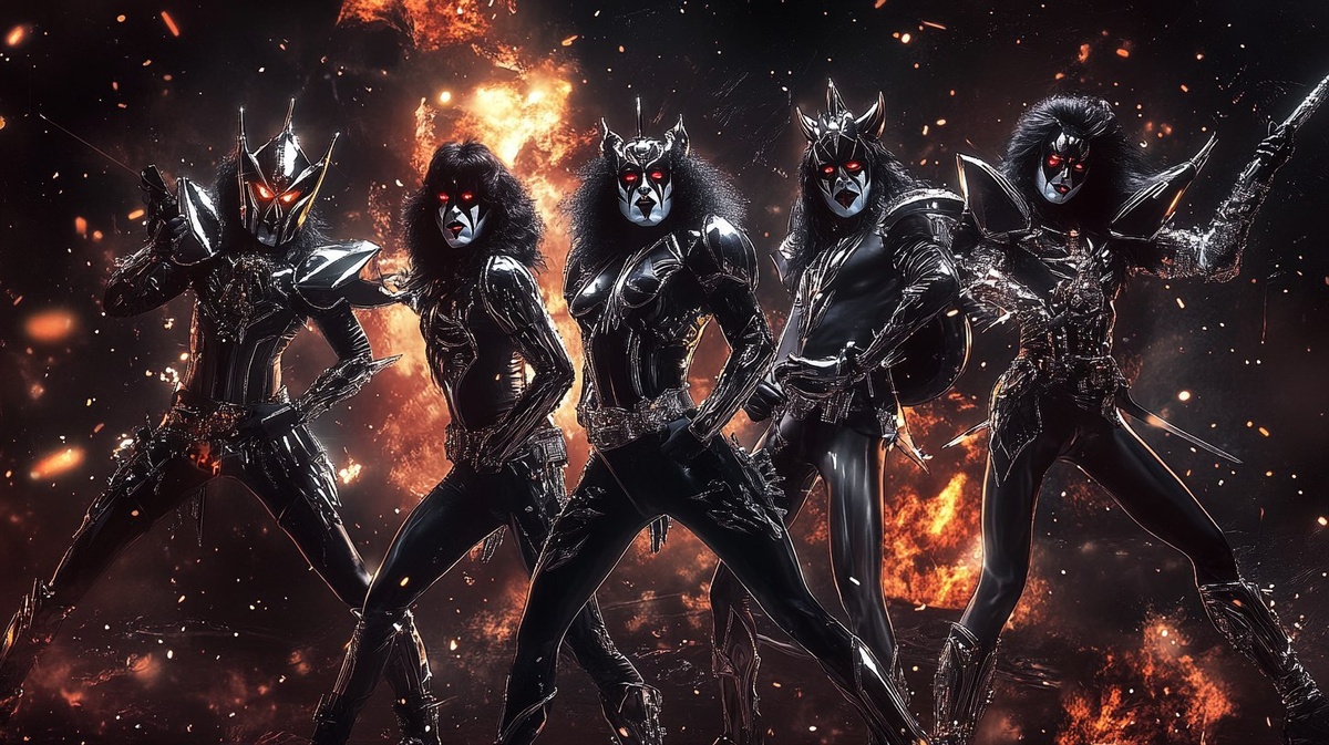 Создано на основе запроса: The band KISS as a Super Sentai team, each member in stylized armored suits inspired by their iconic stage