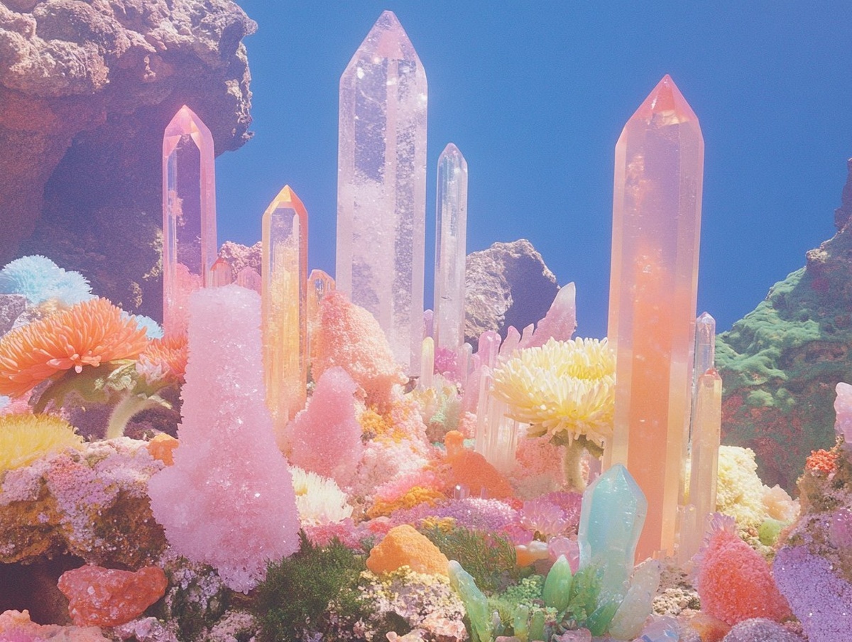 Создано на основе запроса: A crystal and chrysanthemum garden overrun by crustaceans