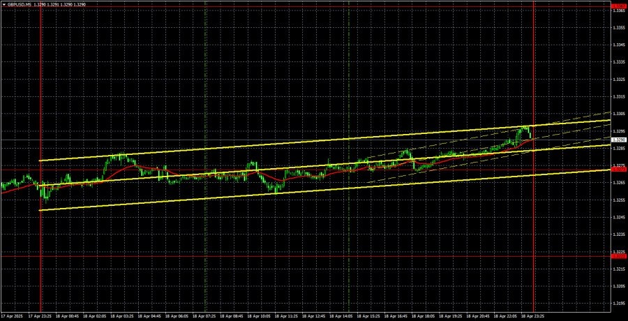 https://basechop.ru/wordpress/?p=39264 Анализ GBP/USD 5М. Валютная пара GBP/USD в пятницу вновь торговалась с повышением, хоть и с минимальной волатильностью. Несмотря на то, что никаких важных событий сегодня в пятницу ни в Штатах, ни в Великобритании(в отличие от других дней недели), рынок все равно упорно продолжал продавливать фунт стерлингов вверх. Волатильность при этом падает практически каждый день. То есть активность трейдеров падает, но они все равно упорно двигают пару на Север. Такому упорству можно лишь аплодировать. По британскому фунту(как и по многие другим валютным парам) картина остается очень простой и очень сложной одновременно. Все зависит от Трампа и его решений по торговой войне. Будут новые тарифы – будет новое падение доллара. Однако на прошлой неделе тарифов не было, но американская валюта все равно продолжала падение. Таким образом, что может спасти сейчас доллар, сказать крайне тяжело. Никаких признаков деэскалации торгового конфликта нет, а рынок ни на ка