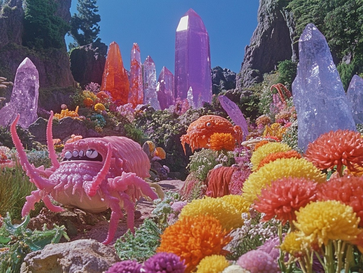Создано на основе запроса: screengrab from 1970s sci-fi b-movie. A crystal and chrysanthemum garden overrun by crustaceans.