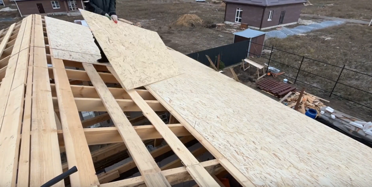 Всё начинается с идеального основания. Речь идёт о сплошном настиле из фанеры или ОСП-плит толщиной 9–12 мм. Между листами оставляют зазор 3–5 мм для компенсации температурного расширения. Поверхность должна быть ровной — перепады высоты не превышают 1–2 мм. Мы выбрали ОСП-плиту толщиной 9 мм, поскольку она легче, и поднять её на крышу оказалось проще. Работали вдвоём с женой, за что ей огромное спасибо — вместе строить гораздо веселее!.