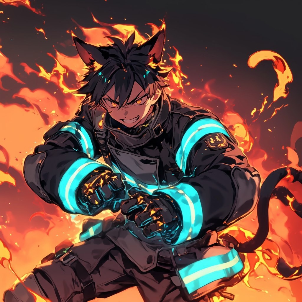 Создано на основе запроса: young male, king dark hair, cocky grin on face, flaming cat ears, dressed like a fire fighter, flaming tail, in a