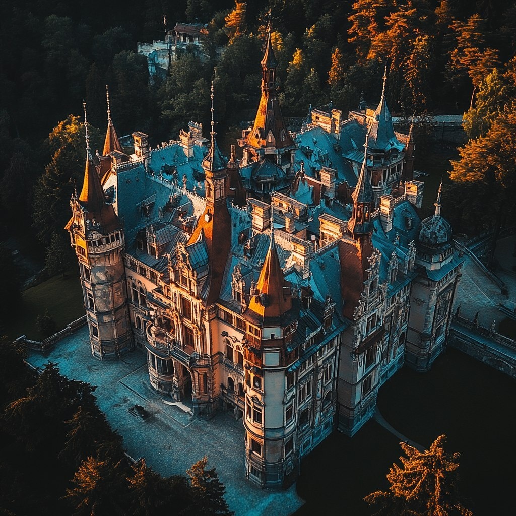 Создано на основе запроса: Peles castle aerial view everything is reflecting and there are intricate old objects arranged so that the light