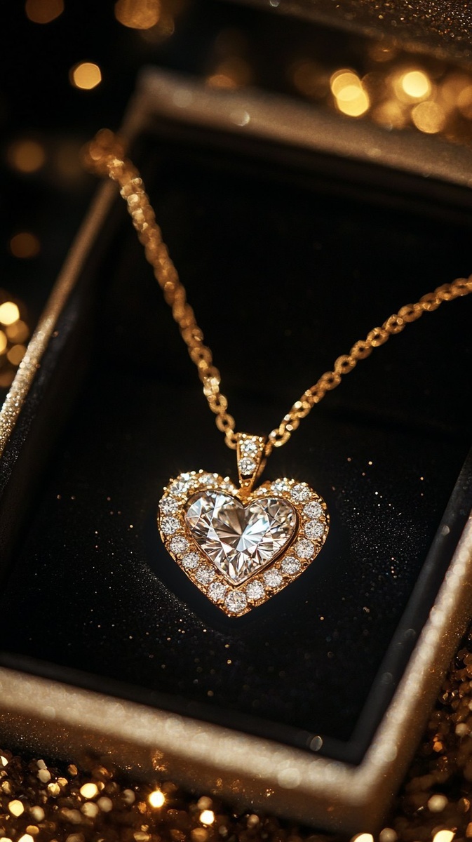 Создано на основе запроса: A heart-shaped diamond pendant in a luxurious box, surrounded by gold glitter and a black background