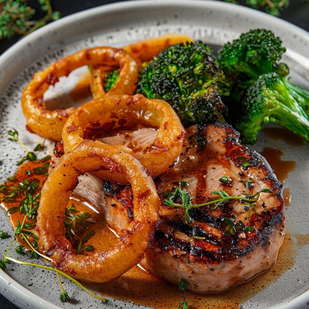 Создано на основе запроса: top view of a culinary dish. served in a nice restaurant. top view of a grilled pork chop dish, served with an apricot glaze on top. onion rings and broccolini --- Автоперевод: Вид на топ кулинарного блюда. Необычно вышло? 🤔 https://dzen.ru/id/65c0c65c86e4f837c27b24d7 #ИИ #AI #нейросеть #midjourney #art