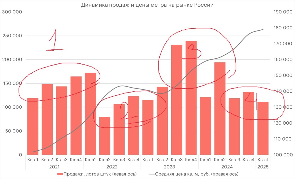 Наглядный график динамики цен и темпов продаж по кварталам: видны основные этапы развития рынка за последние пять лет. 1️⃣ В 2021 году, который стал прекрасным началом, девелоперы были на пике активности. Рынок демонстрировал классическую сезонность — рост продаж от первого квартала к последнему. Девелоперы занимались всем, кроме улучшения строительных процессов. Некоторые активно скупали землю, другие апробировали новые модели продаж, третьи развивали бизнес, покупая проектные институты и архитекторов. Каждый выбирал свой путь в этом успешном году. 🧐 Продажи росли от квартала к кварталу, достигнув пика в первом квартале 2022 года. За год цена выросла на 22%, а финальный квартал этого периода — первый квартал 2022 года — был отмечен завершением сделок. 2️⃣ Во втором квартале 2022 года продажи упали почти наполовину. Но уже тогда было понятно, что цена в недвижимости не соответствует спросу, поэтому даже при таком падении рост цены составил 10%. Удивительно, но девелоперы быстро опра