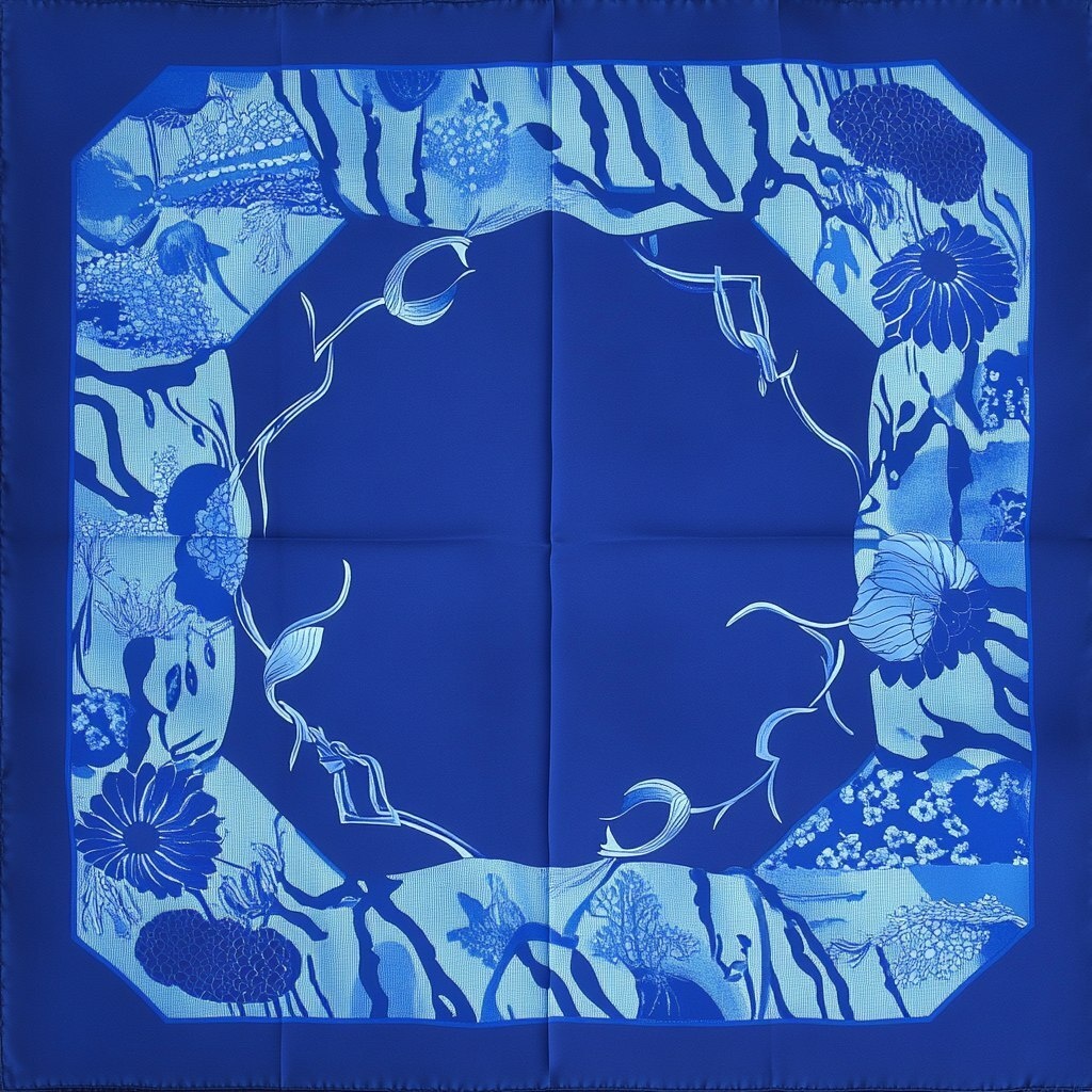 Создано на основе запроса: a Hermes silk scarf with blue and dark blue tones, octagonal geometry, linear lotus flowers, quiet theme design