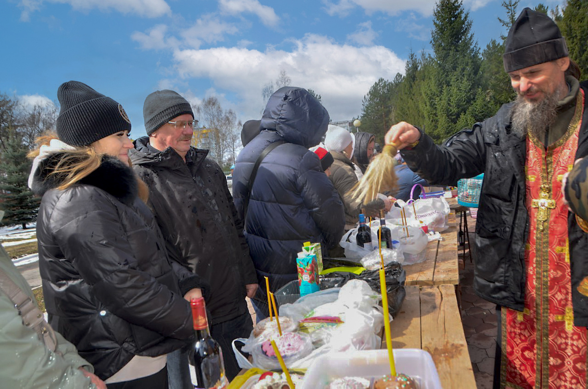 Отвлекся я в раздумьях, а уже батюшка идет освящать куличи прокопчан. А лицо какое у него радостное! И сам улыбаешься в ответ. А он поздравляет кажется, что каждого лично из собравшихся. И с такой искренностью! На душе действительно праздник. Как по заказу выглянуло солнце. И капли, брызги святой воды заискрились в воздухе. Словно жизнь снова заявила о себе, о своей победе.