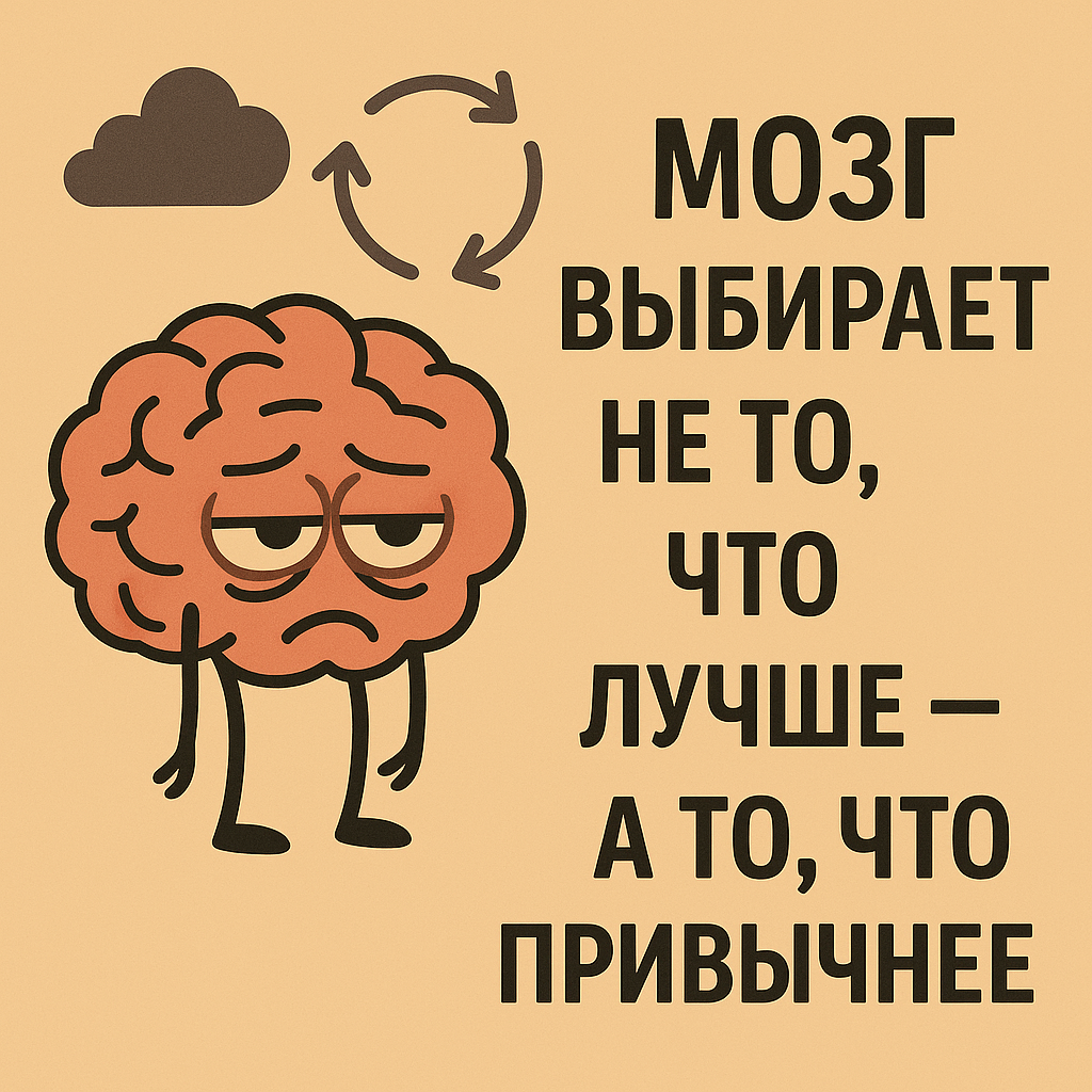 Или: «Снова съел вредную еду, хотя утром клялся, что буду есть салат». Мы хотим перемен. Знаем, как надо. Но продолжаем делать по-старому. Секрет в том, как работает наш мозг. Он не выбирает то, что объективно лучше. Он выбирает то, что привычнее. Мозг — это не коуч, не стратег и не вдохновитель. Это охранная система, главная задача которой — сохранить нам жизнь. А значит, он предпочитает предсказуемое и знакомое. Даже если это не ведёт к росту, счастью или успеху. Новое для мозга = неизвестность, а значит, потенциальная угроза.