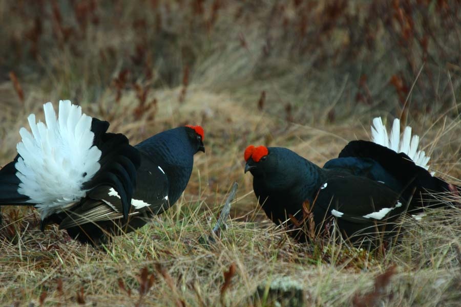 Солнце только начало подниматься, и я увидел их — чёрные силуэты с белыми подхвостьями. Они важно расхаживали, распускали хвосты, дрались между собой. Мои чучела их заинтересовали — один петух подошёл совсем близко.