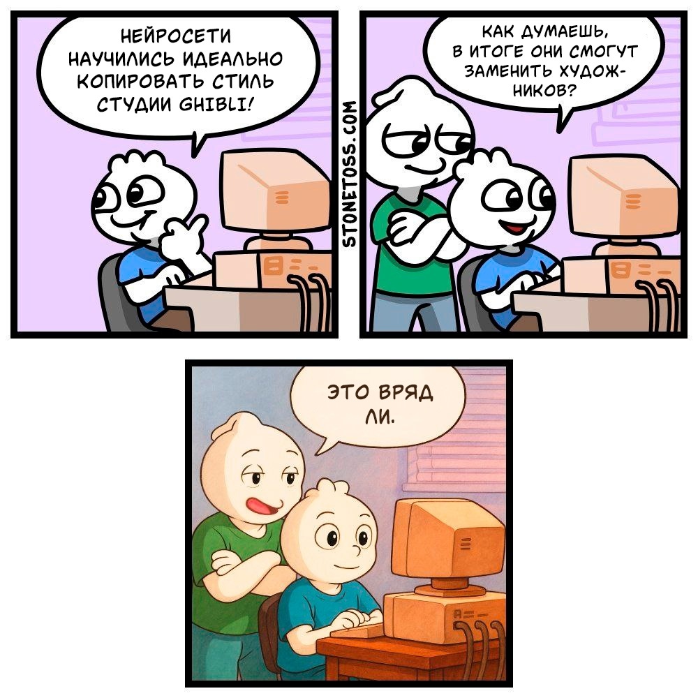 Американский анонимный художник, известный под псевдонимом Stonetoss рисует юмористические комиксы на актуальные тематики. А что может более актуальным, чем нейросети? Недавно в сети вирусились мемы и кадры из фильмов, перерисованные нейросетью в стилистике мультфильмов известной студии Gibli и в первом комиксе из этой подборки как раз обыгрывается этот тренд.