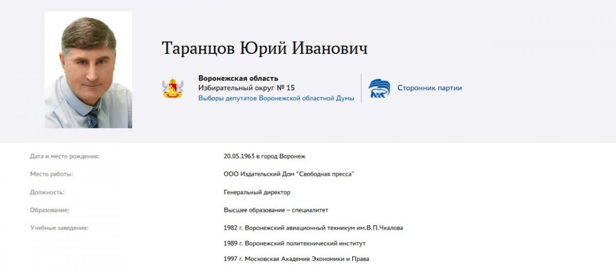 На праймериз «Единой России» выдвинул свою кандидатуру воронежский медиаменеджер Юрий Иванович. Он планирует занять избирательный округ №15 вороблдуме, на который уже подавался в 2020 году. В настоящее время Таранцов занимает должность генерального директора ООО «Издательский дом «Свободная пресса». Эта компания является учредителем местной газеты «Моё!». Таранцов возглавил ООО «Издательский дом «Свободная пресса» в конце 1990-х годов. В этом году на округе №15 у медиа-менеджера есть серьёзные конкуренты. Ранее стало известно о том, что заместитель председателя правительства Воронежской области Виктор Логвинов выдвинулся на праймериз «Единой России» в областную думу по партийному территориальному списку № 15 (Рамонь-Верхняя Хава-Эртиль). Ранее от этой же территории, но по одномандатному округу выдвинулся первый зампред областной думы Александр Солодов.