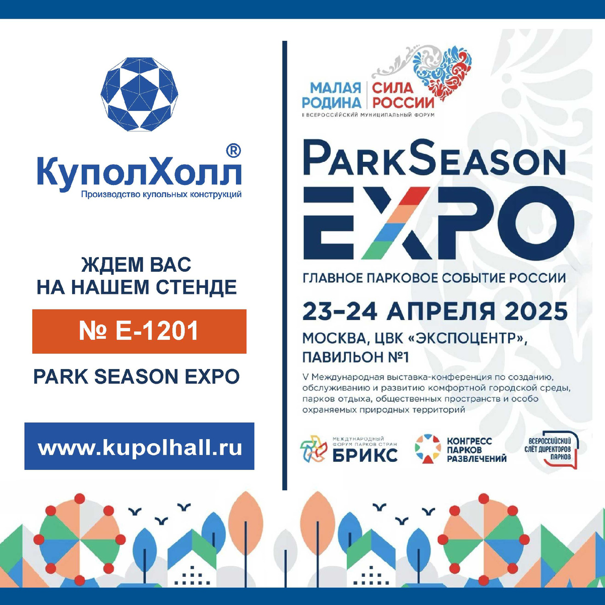 Друзья, мы рады сообщить, что "КуполХолл" станет участником V международной выставки Park Season! 🎪 📍 Москва, ЦВК "Экспоцентр", павильон 1 (Стенд "КуполХолл - № Е-1201)