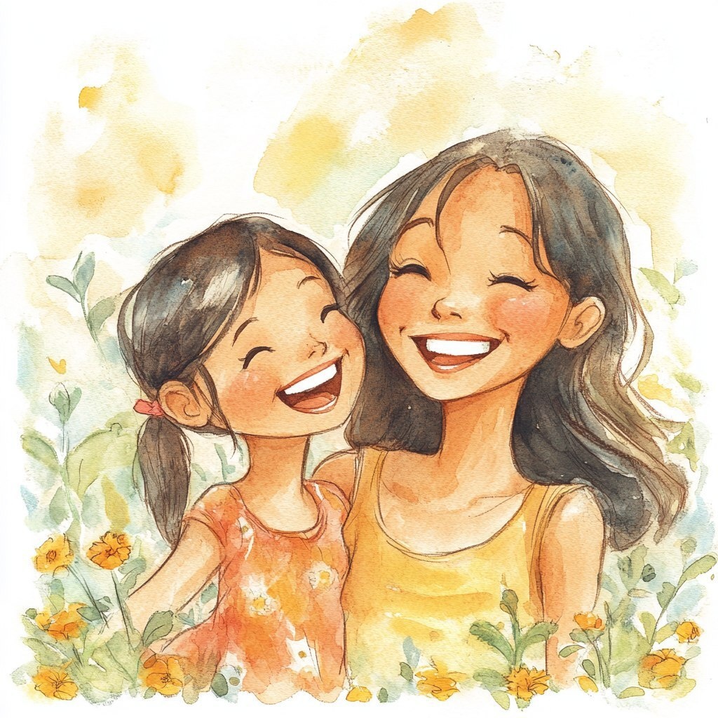 Создано на основе запроса: soft watercolor illustration of pinay mother and daughter laughing together, no background