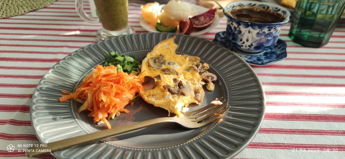 - Добавьте к омлету салат (сейчас из корнеплодов, у меня на фото из морковки с оливковым маслом, чесноком и сыром пармезаном)