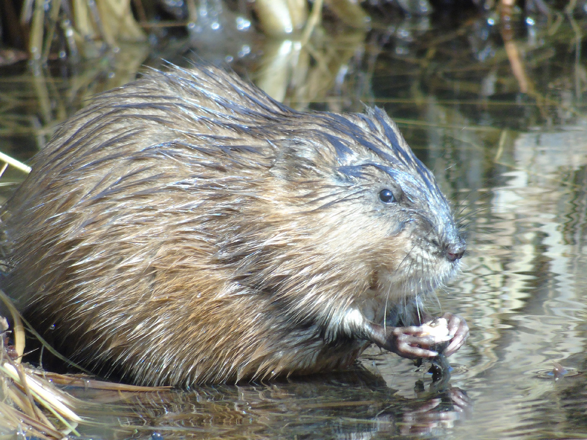 Ондатры из семейства хомяковых. Внешне бобр и крыса в одном лице. На берегу они увальни, в воде - шустрики. Все части тела словно созданы, чтобы рассекать водную гладь. Зрение и обоняние у ондатры не очень. Зато прекрасно развит слух. Потому она всегда прислушивается к звукам. Подойти к ней близко - ещё та задача. Но заместителю начальника Минусинской лесопожарной станции Максиму Дрюкову это удалось.