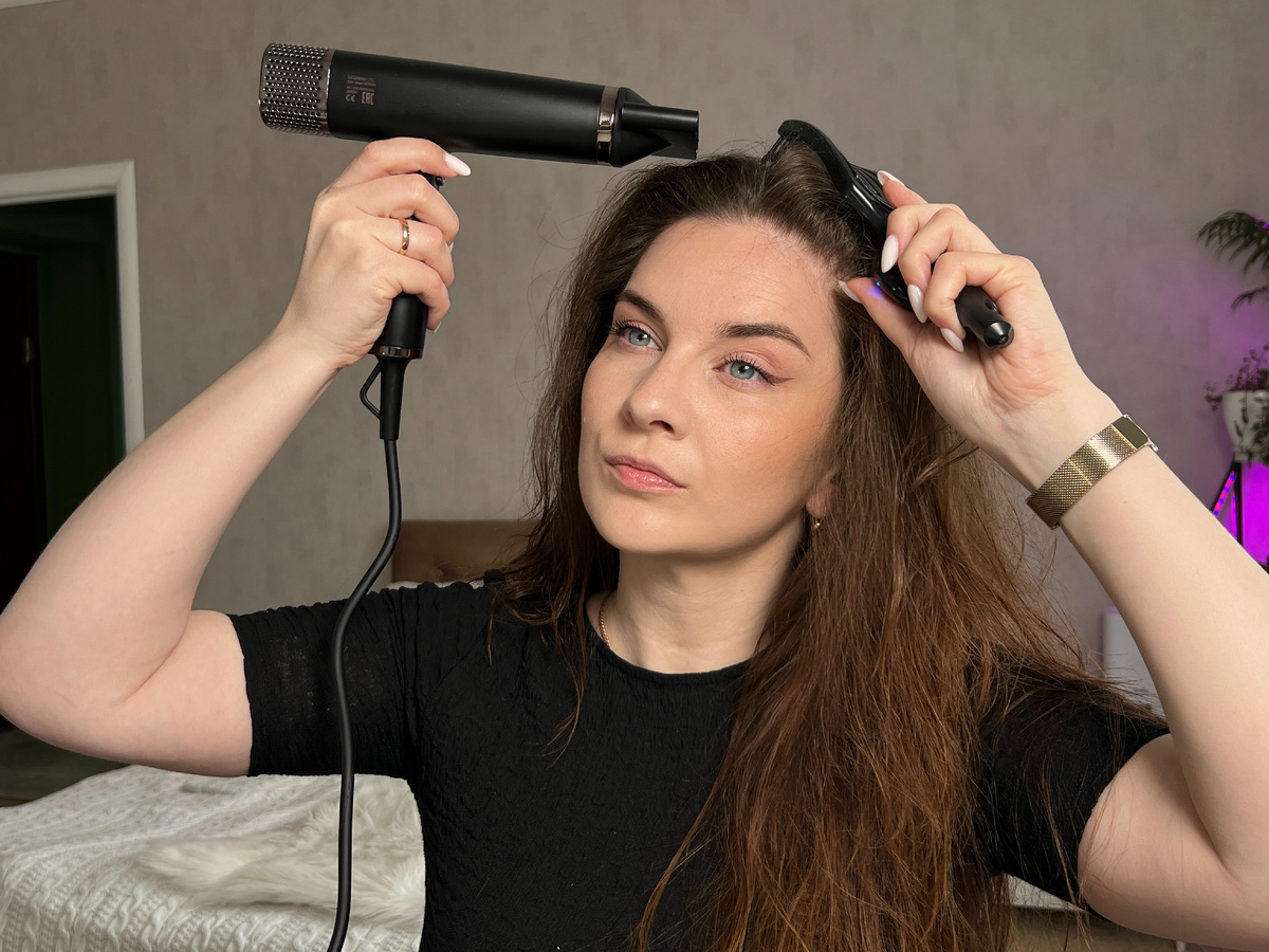 Самое интересное лично для меня. Это не первый мой фен с подобными насадками, и мне было очень интересно посмотреть их в работе с моими волосами. Точнее, как насадка будет подхватывать волосы, ведь это один из подлинных показателей мощности фена.