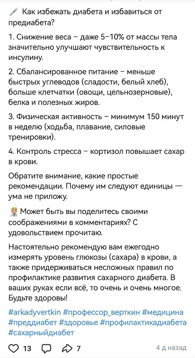 💡Иногда врачи такие простые...) Наткнулась на пост высокоуважаемого мною и многими другими врачами профессора А. Л. Вёрткина из Москвы. Он написал простые, правильные слова относительно предиабета, и как его избежать. Но он в раздумьях, почему же люди не делают такие простые вещи. А я для себя всё поняла уже давно. Чаще всего человек пытается справиться со всем один, не прибегая к помощи. И терпит крах уже на этом начальном этапе. Ну не умеют люди самостоятельно так быстро переключаться на совершенно другой образ жизни. А последний 4 пункт - как его понимать? " Контроль стресса" .... Кто-нибудь знает, как его можно контролировать? Я считаю, за такими простыми советами стоит очень сложная работа человека над собой, а также внимательное ВЕДЕНИЕ человека специалистом. ⚠️Это не должен быть один прием в клинике (или одна онлайн-консультация). Сейчас врачи не зря вводят у себя услуги именно долговременного ведения. Только на ведении будет хороший результат. И только на ведении можно науч