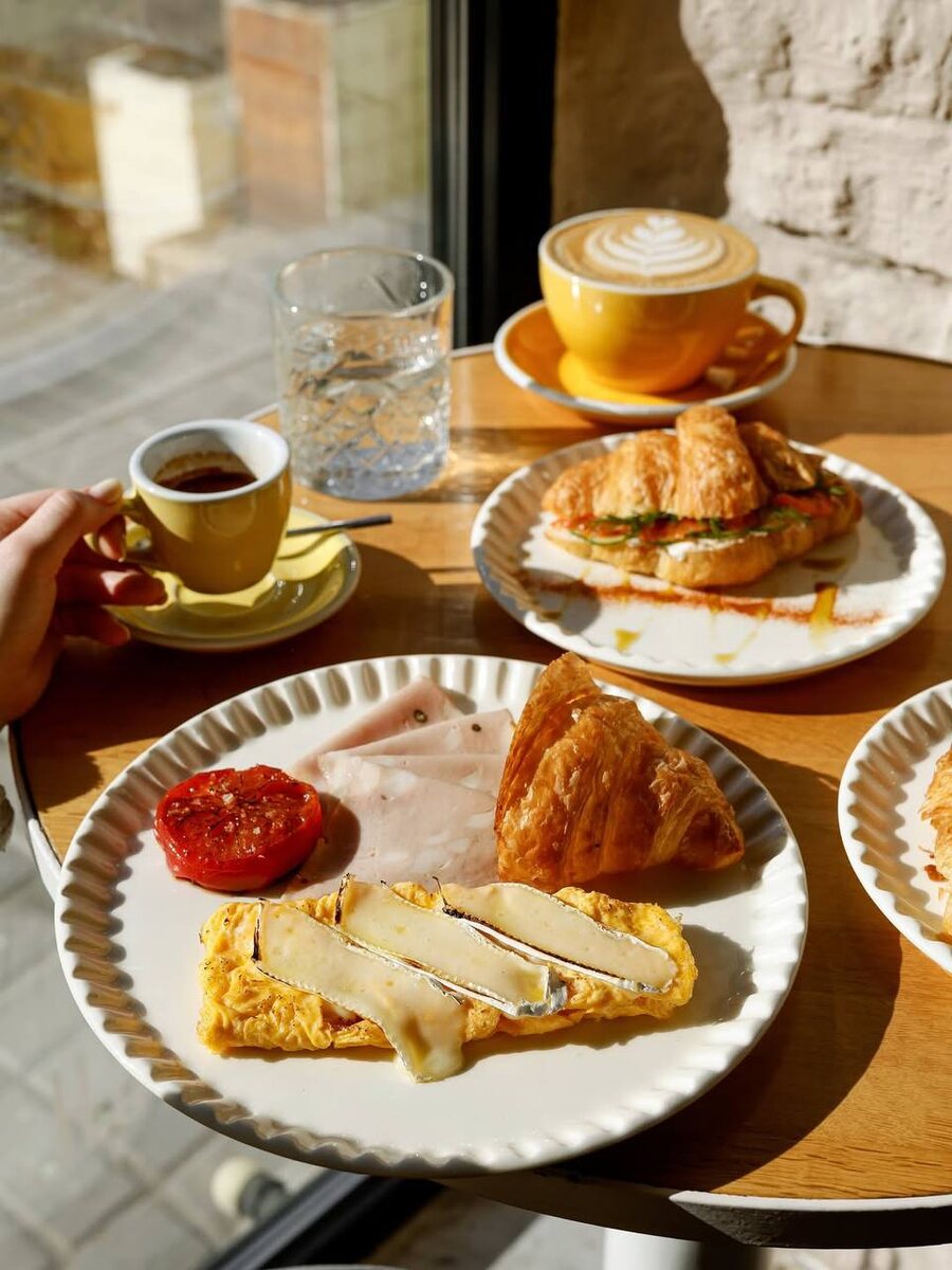 #Москва #Завтрак Давно не вспоминали место, которое идеально подходит для утренних встреч — кафе Finch. Чем позавтракать в нашу летнюю весну: •Стейк с омлетом (890₽); •Панкейки с вишней и шоколадом (590₽); •Круассан с мортаделлой, песто и страчателлой (750₽); •Сырники с черникой и крамблом (530₽). Самое время прийти на веранду за панкейками — завтраки и бранчи подают целый день. Большая Серпуховская ул., 5