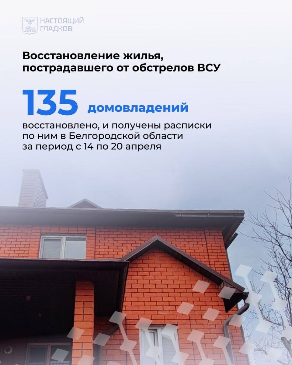 В Белгороде за прошлую неделю восстановлено 20 объектов. За этот же период повреждения выявлены в 19 жилых помещениях. В работе — 82.