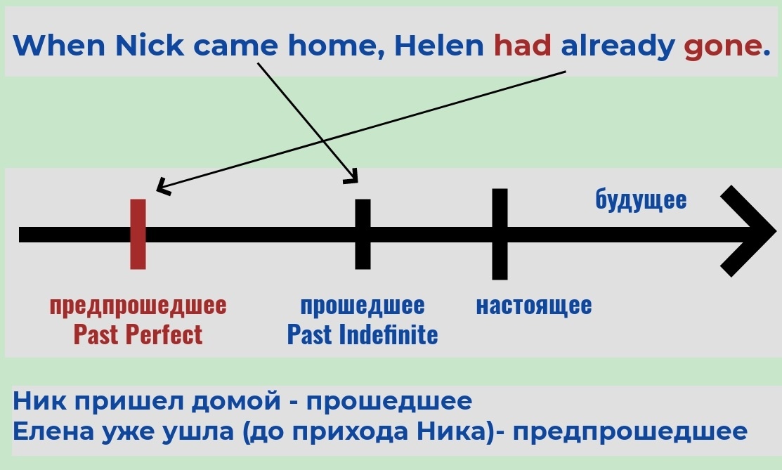Или же, например, вы проснулись вчера в 10 часов, а кто-то из ваших домочадцев уже приготовил вкусный завтрак, аромат которого вас и разбудил. То есть, вы проснулись в 10 утра это Past Indefinite, а завтрак то приготовили раньше 10 часов, значит это и будет предпрошедшее время, которое завершилось до другого прошедшего действия.