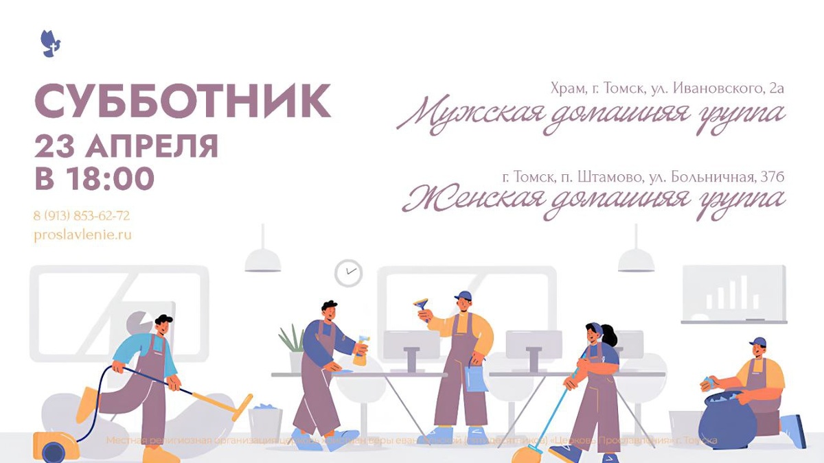 Дорогие братья и сестры! Приглашаем вас на общие женские и мужские домашние группы. Перед началом лета мы устраиваем общий субботник🤩🥳 23 апреля в 18:00 •🙋🏻♀️💁🏼♀️Сестры! Нужна ваша помощь в уборке "Молитвенной горы", по адресу г.Томск п. Штамово, ул. Больничная, 37б. •💁🏻♂️🙋🏼♂️ Братья! Ваша помощь нужна будет в Храме, по адресу г.Томск, ул. Ивановского, 2а. Форма одежды - рабочая. Также в Храме и в Штамово будет служить наш старший пастор Олег Тихонов🙌🏼 Не упустите возможность получить благословение! Ждем каждого из вас и благодарим!