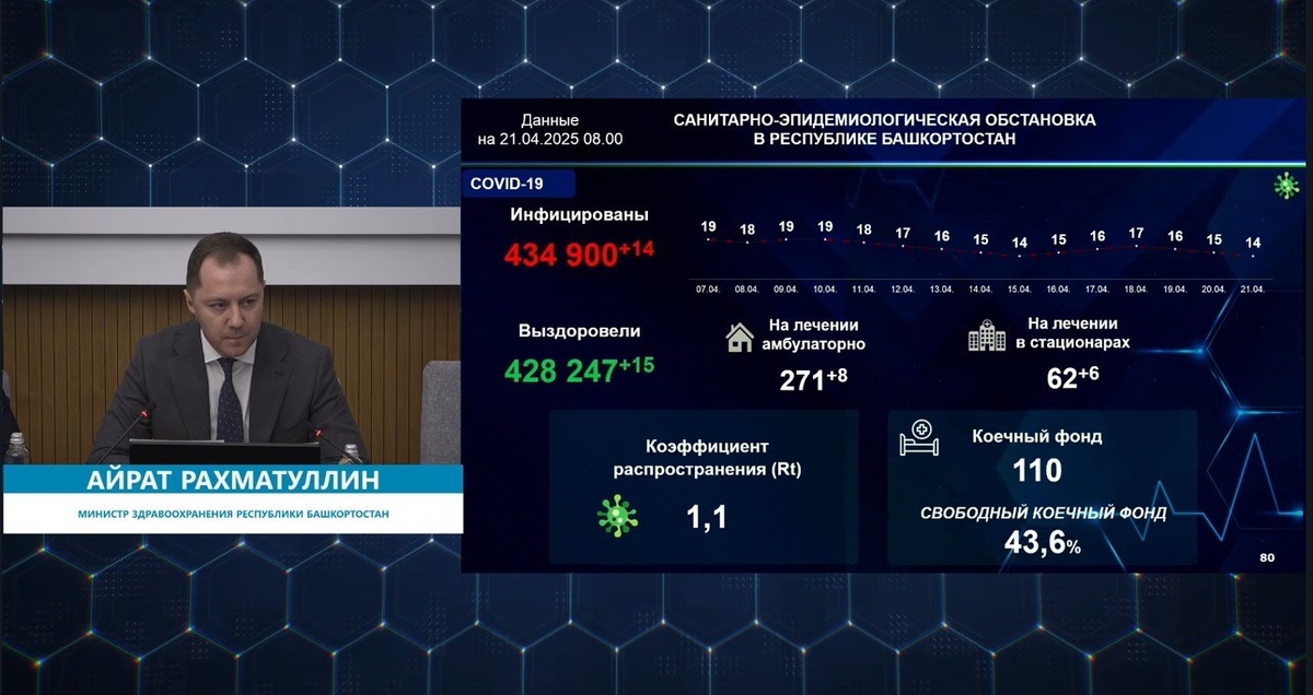 В Башкирии за минувшие сутки выявлены 14 случаев заболевания коронавирусной инфекцией. Об этом сегодня в ходе оперативного совещания правительства в ЦУРе сообщил министр здравоохранения республики Айрат Рахматуллин. На сегодняшний день на стационарном лечении находятся 62 пациента с подтверждённым диагнозом ковид, амбулаторное лечение проходят 271 человек. Свободный коечный фонд в медучреждениях региона составляет 43,6%. По оперативным данным, на прошлой неделе в республике скорая медицинская помощь совершила 20 365 выездов, причём более 93% из них добралась до больных за 20 минут. Айрат Рахматуллин также сообщил о начале ежегодной акции «Здоровая республика — здоровый регион». По его словам, она продлится до 16 сентября этого года с охватом всех муниципалитетов. В акции задействованы 11 передвижных флюорографов, 11 маммографов, 48 мобильных ФАПов, 9 передвижных центров здоровья, в том числе один детский, кардиомобиль и передвижная поликлиника РКБ имени Куватова. В состав входят узкие