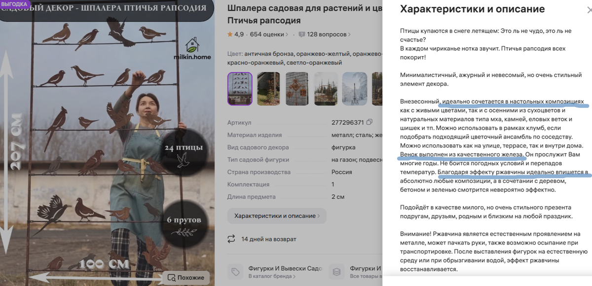 Весной пыталась найти себе решение шпалерного вопроса к плетистым розам, особенно актуально это для Эш Веенсдей которая за прошлый год выдала несколько плетей по 2 метра и боюсь в этом сезоне после цветения результат наращивания массы будет еще более впечатляющий. Маленькая тощенькая шпалера прошлого года тут как бумажный кораблик для кирпича, так себе опора. Пока разыскивала что-то подходящее из готового наткнулась на очень красивую и на первый взгляд довольно приличную так как она металлическая шпалеру Птичья рапсодия. Но есть нюансы на стадии изучения страницы товара бросаются в глаза ляпы? в описании или как это назвать. Ржавая железка с габаритами 1х2 метра в настольную композицию это очень занимательно. Следующая фраза про венок, вообще не понятна и создает ощущение что описание слизано с заграничного сайта и криво переведено в автоматическом режиме. Эффект ржавчины отдельно порадовал, для меня эффект- это когда вид ржавый, а руки не пачкаются, тут же просто ржавое железо. Нет