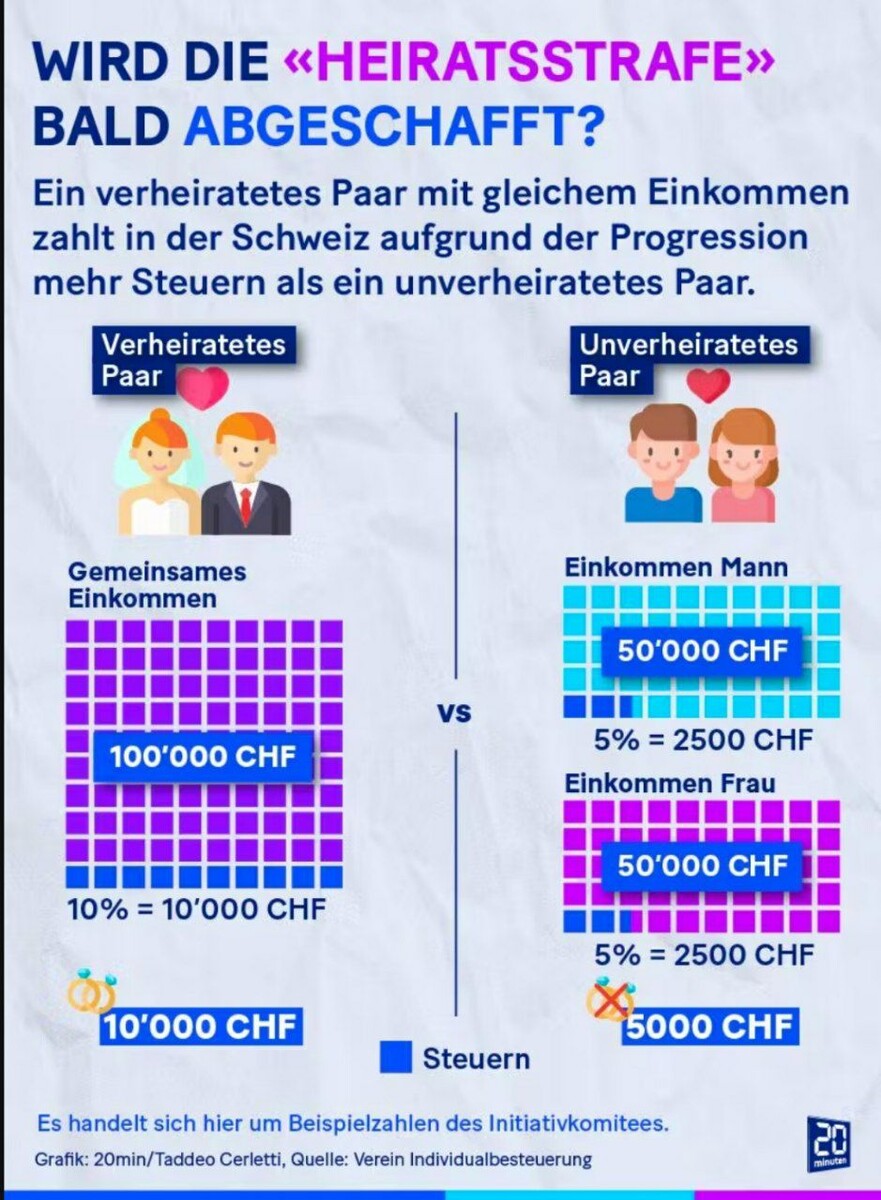👀 В картинках и цифрах на схеме . Быть сейчас в официальном браке в Швейцарии по налогам вдвое не выгодно, чем не быть . Ну или хотя-бы имитировать не зависимость от института брака. " Наказание за брак" - уникальный швейцарский термин. И да, гутен морген ! " Леволиберальный компромисс: налоговая революция на пороге. Политики давно хотели отменить брачный штраф: Индивидуальное налогообложение скоро будет обсуждаться в Национальном совете, и после долгих споров компромисс, похоже, найден Леволиберальный альянс СП, СвДП, "зеленых" и ГЛП поддерживает законопроект - но долгое время пытался найти компромисс. Кроме того, против законопроекта последовательно выступают центристы и SVP: в Государственном совете в него были внесены значительные поправки. Недавно законопроект был еще раз пересмотрен в комитете Национального совета. #Швейцария