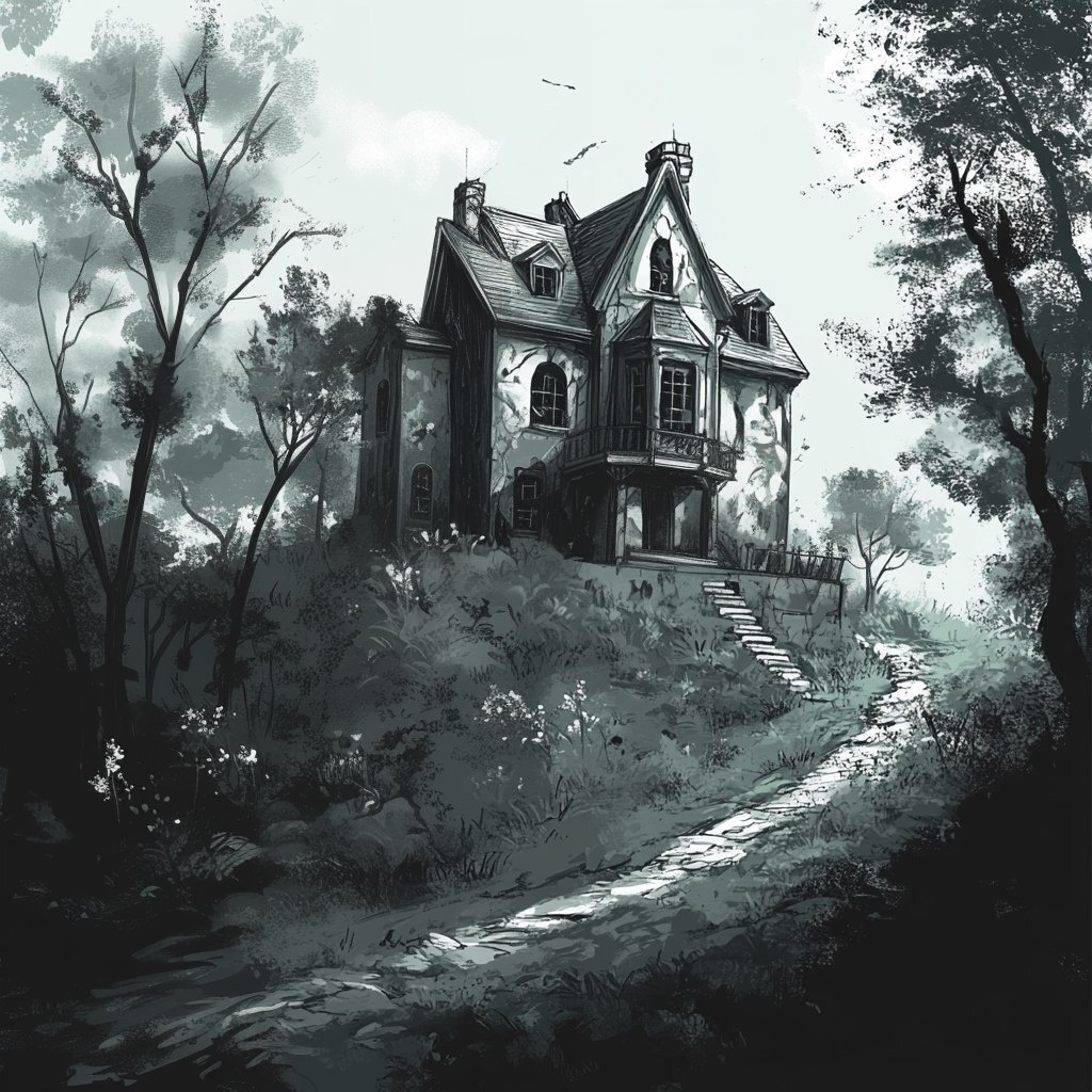 Создано на основе запроса: thick bushes oak elm trees green leaves obscuring abandoned ruined mansion on steep hilltop forest scribble style