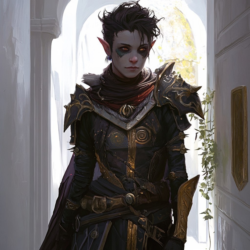 Создано на основе запроса: fey trickster character, d&d style, inside a white corridor