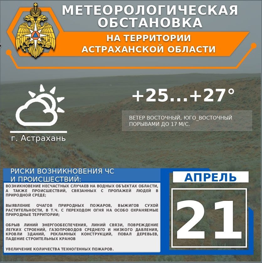 По г. Астрахань небольшая облачность🌤. Без существенных осадков. Ветер💨 восточный, юго-восточный порывами 17 м/с. Температура🌡 воздуха +25...+27°.