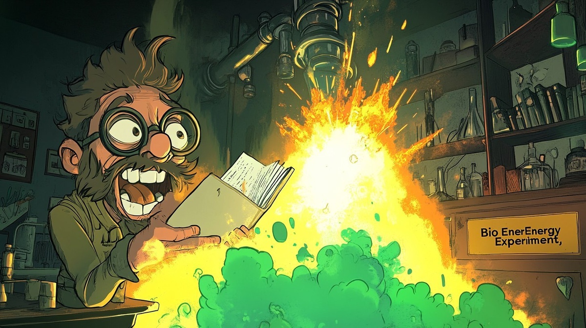 Создано на основе запроса: a dramatic anime-style scene of a cartoonish pile of animal dung emitting thick green fumes, with a steampunk-style contraption nearby sparking and exploding in bright comic-style fire, Thomas Edison in the background with a wild grin, wearing goggles, holding a notebook labeled "Bio Energy Experiment," exaggerated cartoon effects like BOOM! and smoke clouds, detailed messy lab environment, over-the-top humor, high contrast lighting, comic-book energy lines