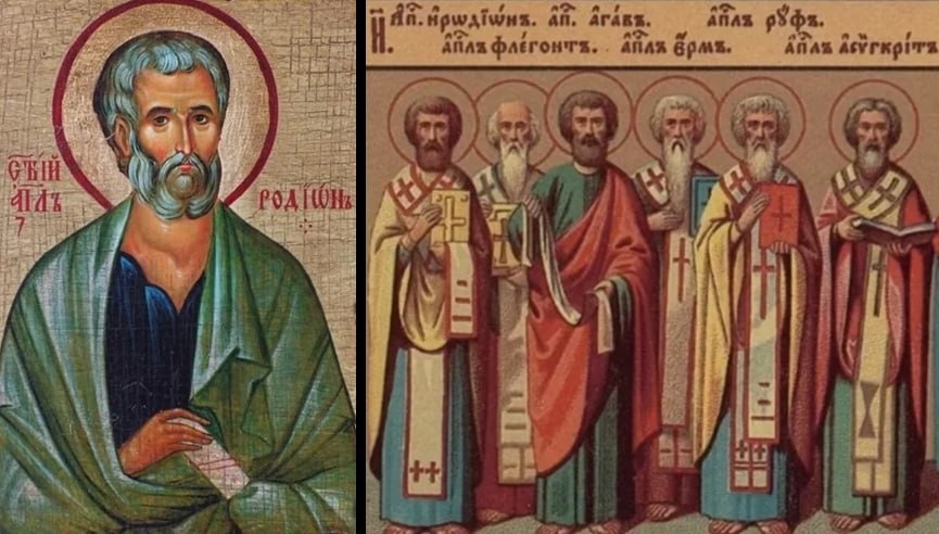 Сегодня Церковь чтит память апостола от 70-и Родиона (Иродиона), епископа Патрасского Святой апостол Иродион был родственником апостола Павла и его спутником во многих путешествиях. Когда христианство распространилось на Балканском полуострове, апостолы Петр и Павел поставили апостола Иродиона епископом города Патары. Апостол Иродион ревностно проповедовал Слово Божие и многих обратил в христианство. Как-то идолопоклонники, разъяренные проповедью апостола, напали на Святого Иродиона, стали избивать палками и забрасывать камнями. Один из мучителей ударил его ножом, и апостол упал. Но когда убийцы скрылись, Господь восставил Иродиона невредимым. Еще долгие годы Святой Иродион сопутствовал апостолу Петру. Когда Святой апостол Петр был распят, одновременно с ним, а также вместе со святым Олимпом, был усечен мечом и апостол Иродион. Также сегодня мы вспоминаем апостолов от 70-и Агава, Асинкрита, Руфа, Флегонта и Ерма. Святой апостол Агав обладал даром пророчества. Он предрек голод во
