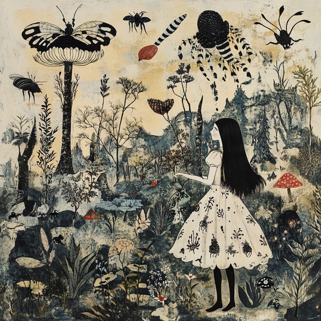 Автоперевод: Алиса (персонаж Левин Кэрролл) в ландшафте, запутанном растениях, кустарниками и деревьях, в симбиозе с другими живыми существами (насекомыми, животными), древний японский стиль
