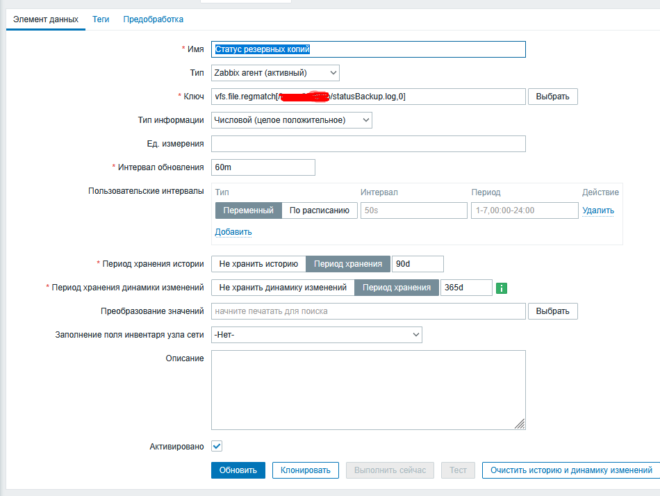 После этого создаем триггер last(/utl_backup/vfs.file.regmatch[*/statusBackup.log,0])<>1 если значение не найдено то возвращаем 0 если найдено то 1. Триггер срабатывает если значение не равно 1.