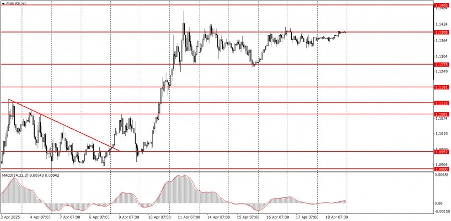 https://basechop.ru/wordpress/?p=39279 Разбор сделок пятницы: 1Н график пары EUR/USD. Валютная пара EUR/USD в пятницу не показала абсолютно никаких движений. Вчера была Страстная пятница, а в воскресение – Пасха. Таким образом, во многих странах мира был выходной день, а площадки были закрыты. Соответственно, торги просто не проводились на межбанковском уровне. Как следствие, на рынке не было никаких движений. Также в этот день не было никаких макроэкономических или фундаментальных событий. 5M график пары EUR/USD. На 5-минутном ТФ в пятницу не было сформировано ни одного торгового сигнала, а общая волатильность дня составила 37 пунктов. Заходить в рынок не имело никакого смысла. Советуем ознакомиться с другими статьями автора: Обзор пары EUR/USD. 21 апреля. Рынок уснул, только Трамп может его пробудить. Обзор пары GBP/USD. 21 апреля. Инерционный рост продолжается. Торговые рекомендации и разбор сделок по EUR/USD на 21 апреля. Торговые рекомендации и разбор сделок по GBP/USD на