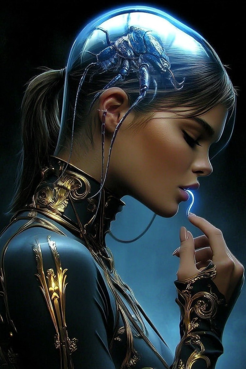 Создано на основе запроса: kaia gerber rebuilt clone, ai crustacean hud ui fui, glass claw, transparent glass with glowing worm tongue, led