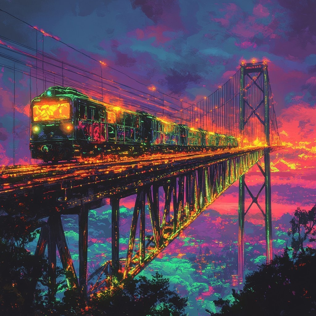 Создано на основе запроса: radiation glowing train cars going on a tall suspension bridge, super colorful, liquid colors