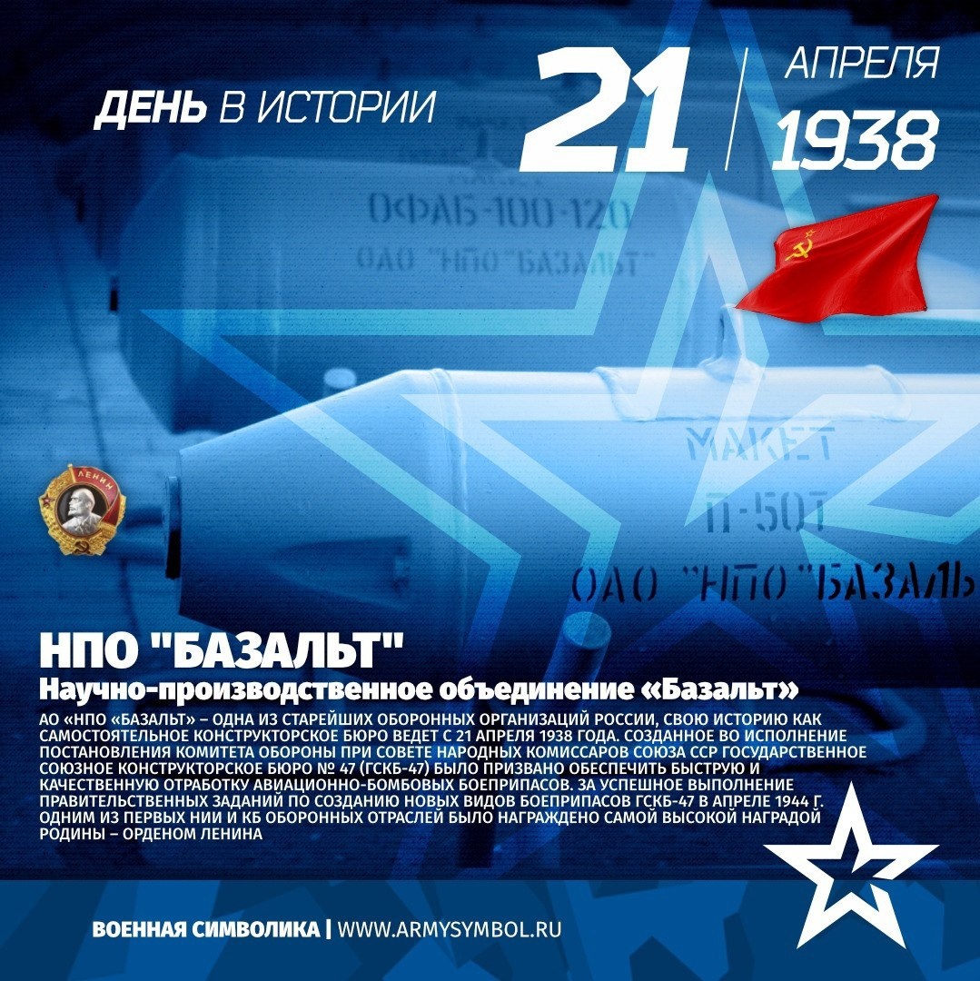 «Научно-производственное объединение «Базальт» с 1938 АО «НПО «Базальт» – одна из старейших оборонных организаций России, свою историю как самостоятельное конструкторское бюро ведет с 21 апреля 1938 года. Созданное во исполнение Постановления Комитета обороны при Совете Народных Комиссаров Союза ССР Государственное союзное конструкторское бюро № 47 (ГСКБ-47) было призвано обеспечить быструю и качественную отработку авиационно-бомбовых боеприпасов. За успешное выполнение правительственных заданий по созданию новых видов боеприпасов ГСКБ-47 в апреле 1944 г. одним из первых НИИ и КБ оборонных отраслей было награждено самой высокой наградой Родины – Орденом Ленина #ПамятныеДатыВоеннойИсторииОтечества #ДеньВИстории #ГодЗащитникаОтечества #80ЛетВеликойПобеды Источник: https://vk.com/wall-60767131_30448 Подпишитесь на наши группы ВКонтакте и в Одноклассниках - читайте, смотрите и комментируйте! Источник