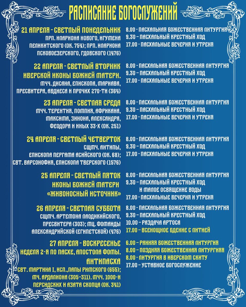 Расписание богослужений Светлой седмицы 21 - 27 апреля
