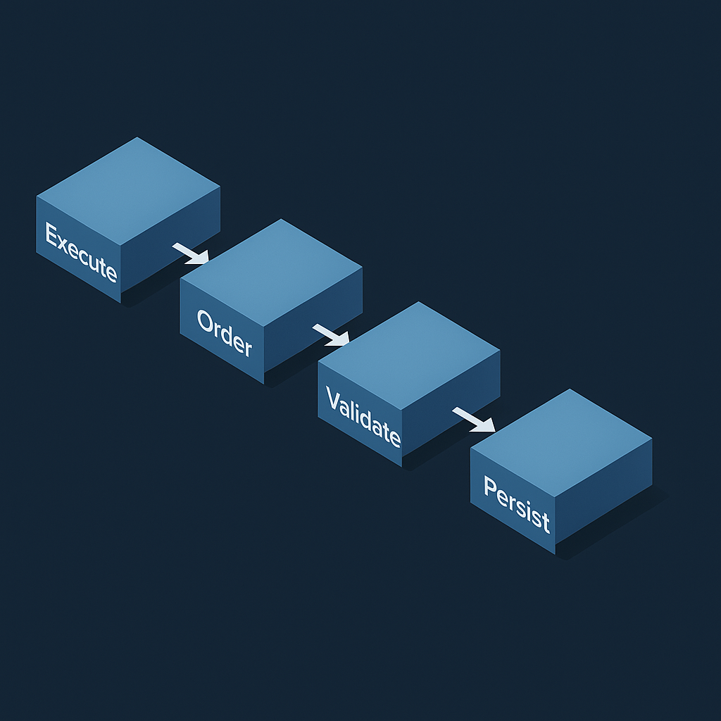 - 🚀 Выполнение → 💾 Сохранение → 🔍 Валидация → 🕒 Упорядочение
