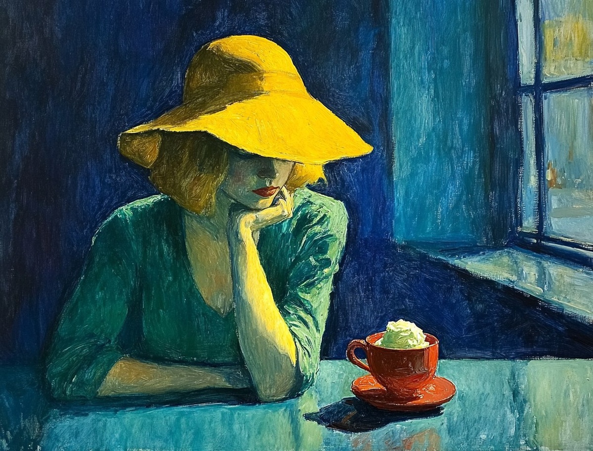 Создано на основе запроса: Edward Hopper's painting of Nighthawks, but with one woman sitting at the table wearing green and a yellow hat. She is eating ice cream, in a red cup in front of her, with a dark blue background. The light from the window on the right side illuminates her face, in the interior of the coffee shop. --- Автоперевод: Картина Эдварда Хоппера о Nighthawks, но с одной женщиной, сидящей за столом в зеленом и желтой шляпе. Какое твое мнение? 🤔 https://dzen.ru/id/65c0c65c86e4f837c27b24d7 #ИИ #AI #нейросеть #midjourney #art