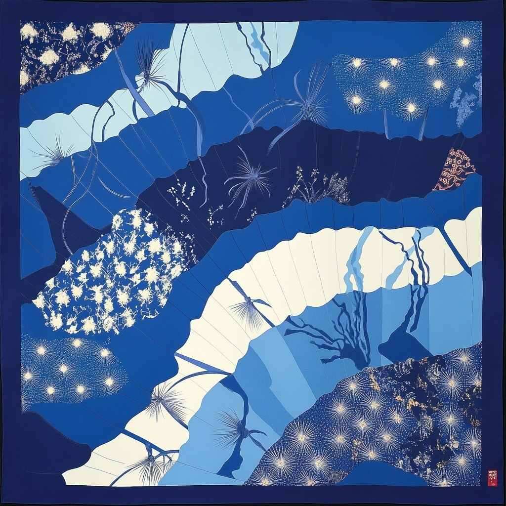 Создано на основе запроса: A Hermes silk scarf, blue and dark blue tones, octagonal flowers, folding fans, quiet theme design, ukiyo-e