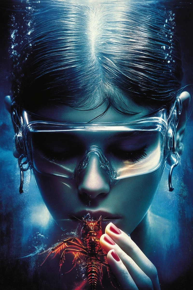 Создано на основе запроса: underwater cavern shot, kaia gerber swimming, ai crustacean hud ui fui, glass claw, transparent glass with