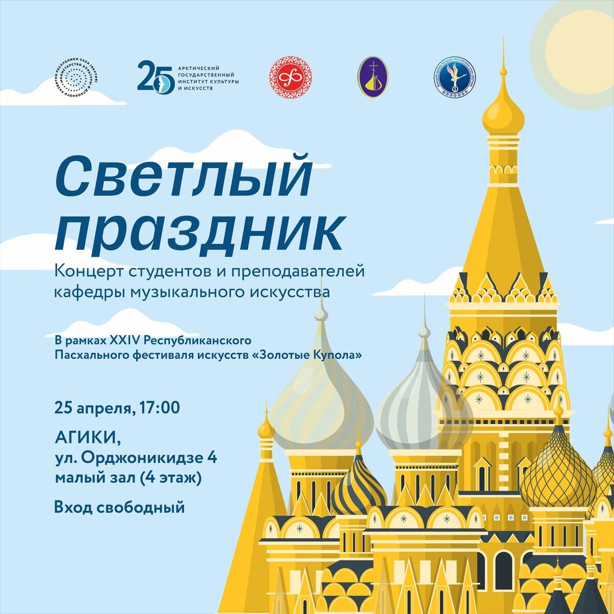 🎼Звучание классики в светлый праздник: в дни Пасхи кафедра музыкального искусства АГИКИ проведет концерт Студенты и преподаватели кафедры музыкального искусства АГИКИ проведут концерт в рамках XXIV республиканского пасхального фестиваля «Золотые Купола». Традиционно в течение пасхальной недели в Якутске на различных творческих площадках проводятся концерты с участием музыкальных коллективов республики. Преподаватели и студенты кафедры музыкального искусства АГИКИ являются постоянными участниками данного торжества. 💬«Мы принимаем участие в фестивале уже более 20 лет. За всё это время мы участвовали в различных форматах. От сольных концертов наших студентов до целого оркестра АГИКИ. В этом году наша кафедра музыкального искусства в рамках фестиваля проведет концерт "Светлый праздник". Он состоится 25 апреля. Слушателей ожидают сольные номера студентов и преподавателей. Также будет ансамблевая музыка. Приглашаем всех в светлый пасхальный праздник посетить наш концерт. Кроме того выст