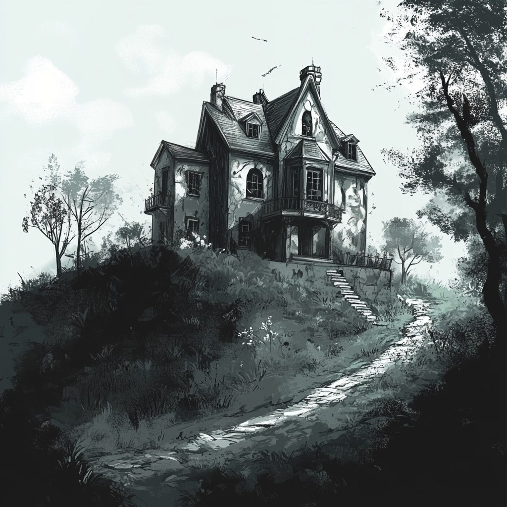 Создано на основе запроса: abandoned ruined mansion small porch on leafy wooded forest steep hilltop scribble style sketch