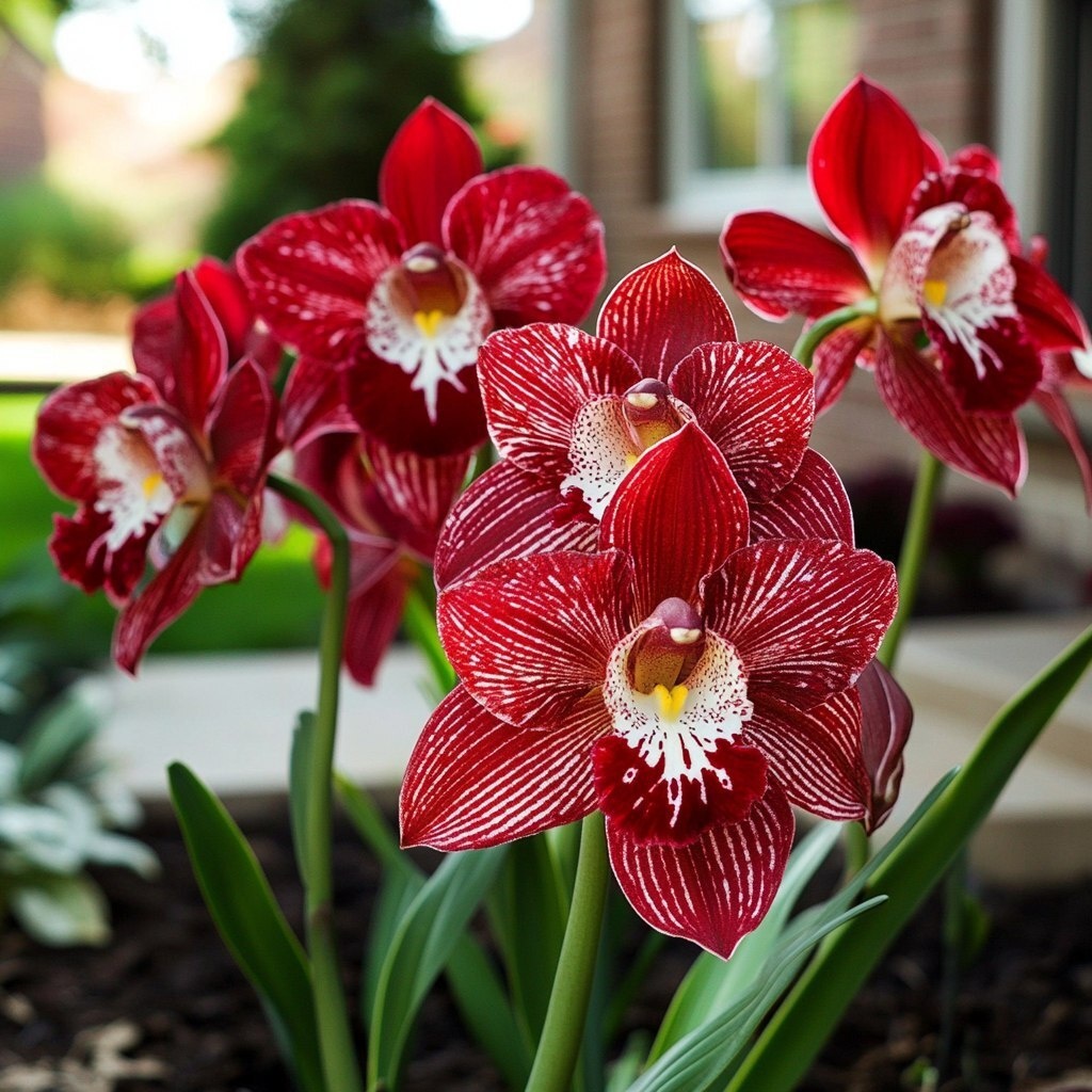 Создано на основе запроса: A realistic flowerbed in front of a cozy suburban house, planted with vibrant red orchids featuring white