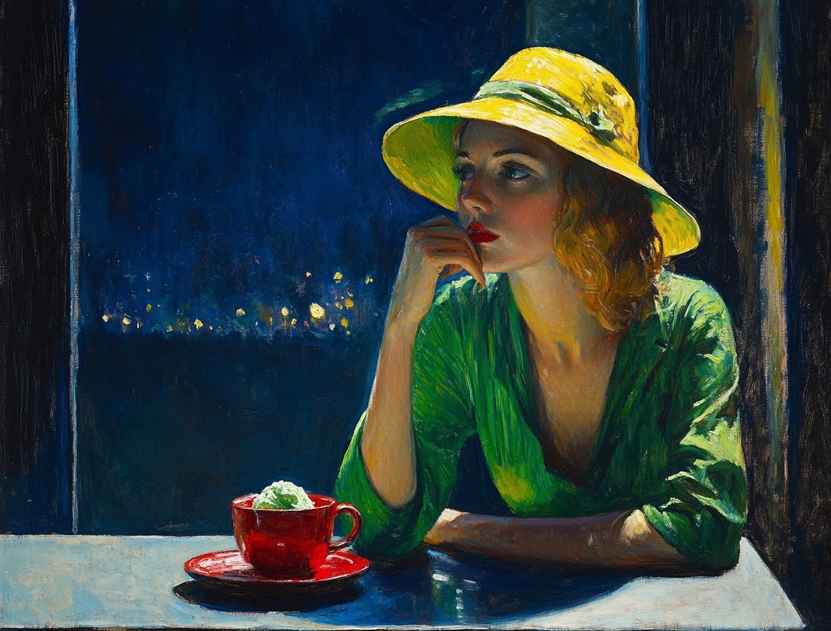 Создано на основе запроса: Edward Hopper's painting of Nighthawks, but with one woman sitting at the table wearing green and a yellow hat. She is eating ice cream in a red cup in front of her, with a dark blue background. The light from the window on the right side illuminates her face, in the interior of the coffee shop. --- Автоперевод: Картина Эдварда Хоппера о Nighthawks, но с одной женщиной, сидящей за столом в зеленом и желтой шляпе. Как тебе такой вариант? 🤔 https://dzen.ru/id/65c0c65c86e4f837c27b24d7 #ИИ #AI #нейросеть #midjourney #art