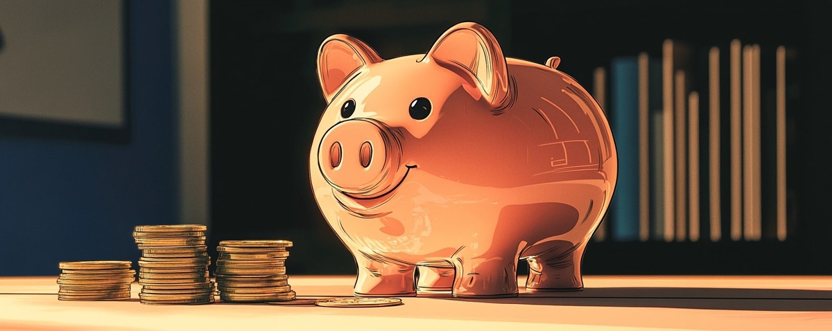 Создано на основе запроса: A porcelain piggy bank stands on a table. Next to it is a stack of coins. The style should feature bold lines, exaggerated features, exaggerated expression, and bright, simple colors to enhance the comic-book aesthetic.